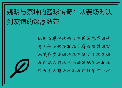 姚明亲临塞尔维亚篮球盛会,不仅引发了广泛的热议,也展现了中塞之间日益深化的友谊。这一事件吸引了全球媒体的目光,成为中塞文化交流和体育合作的新标志。姚明作为中国篮球的代表性人物,其到访不仅加强了两国在体育领域的联系,更为推动中塞友好关系奠定了坚实基础。本文将从四个方面详细阐述这一事件的重要性,包括姚明的个人影响力、中塞篮球交流的历史背景、此次盛会对两国关系发展的意义,以及未来合作展望。通过深入探讨,...